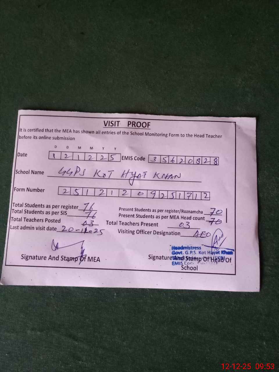 | Attendance Register | Head Teacher | MEA with School | Visit Proof |