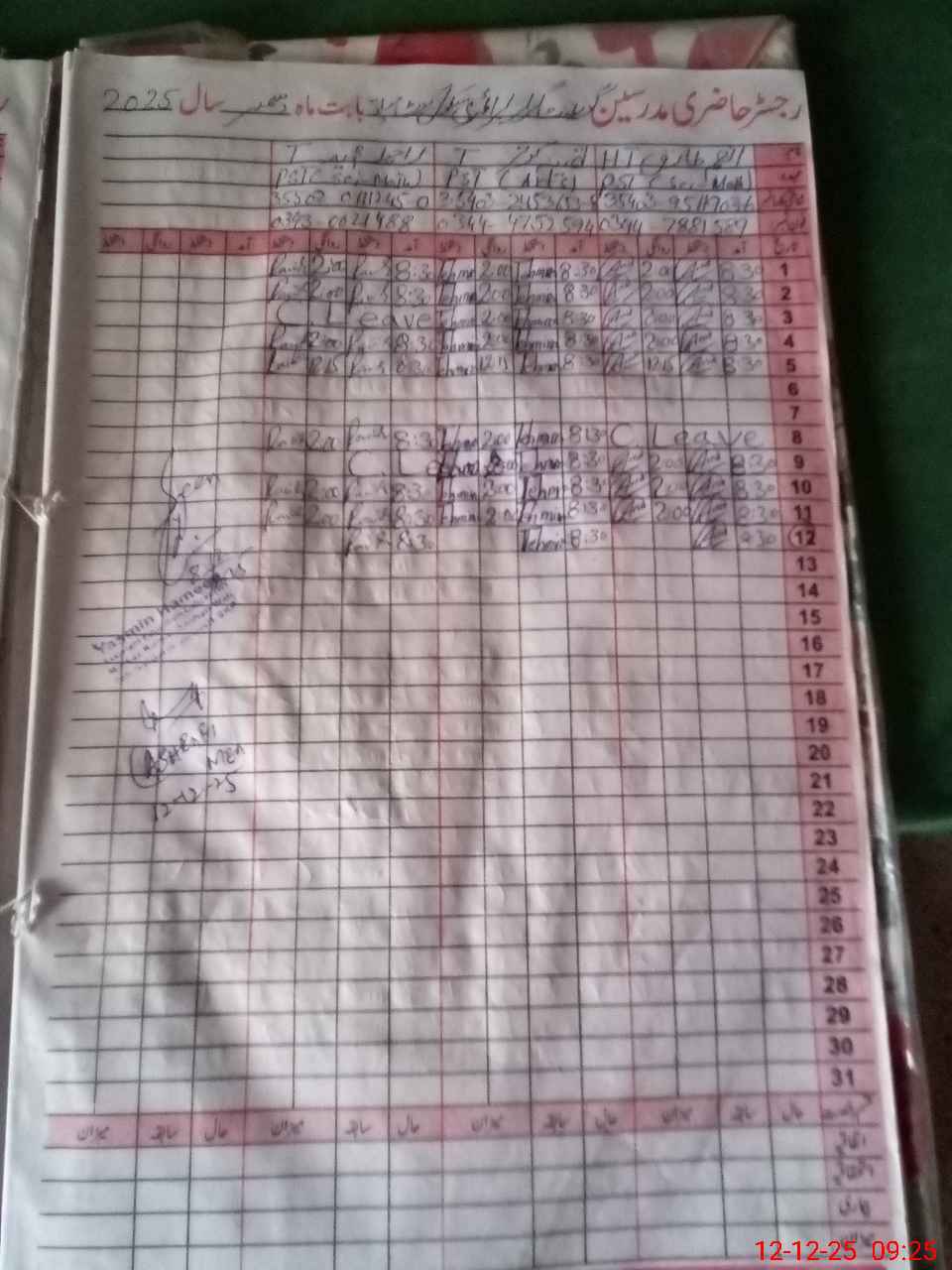 | CNIC | Full Name | Designation | R/C | Absence During Last Calender Month |