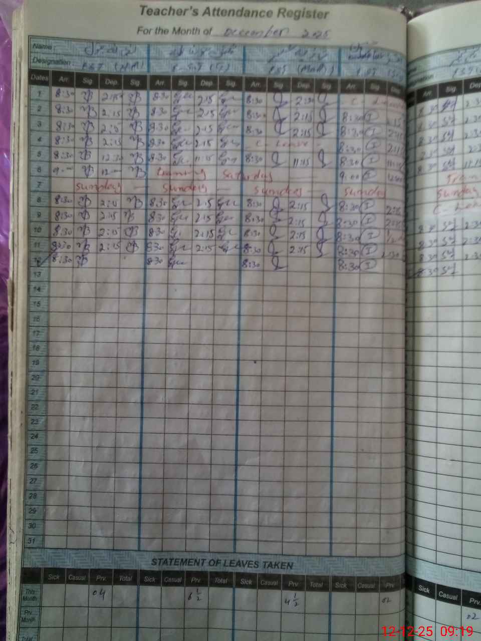 | CNIC | Full Name | Designation | R/C | Absence During Last Calender Month |