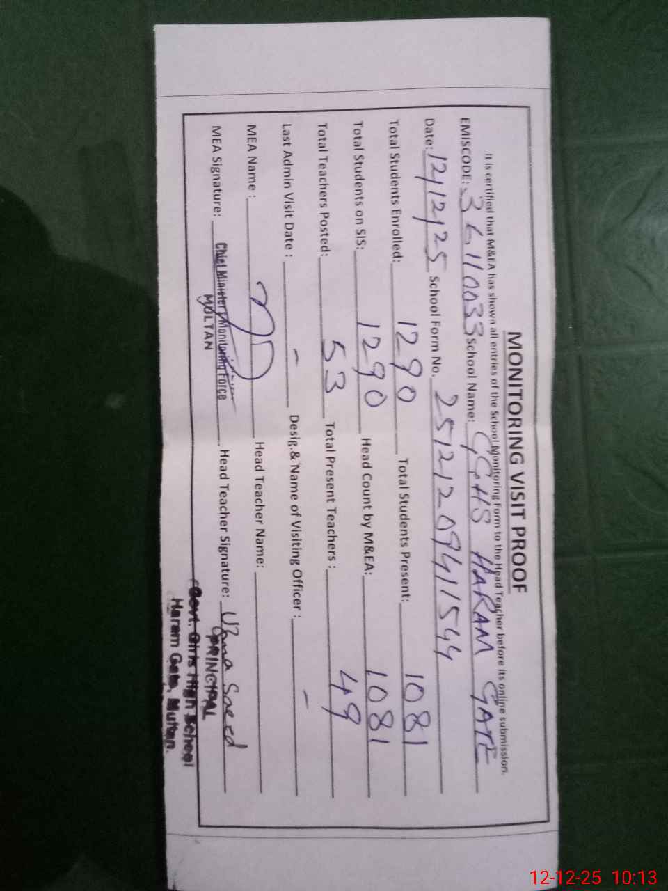 | EMIS Code: 36110033 | Name of School: GGHS HARAM GATE MULTAN | |||