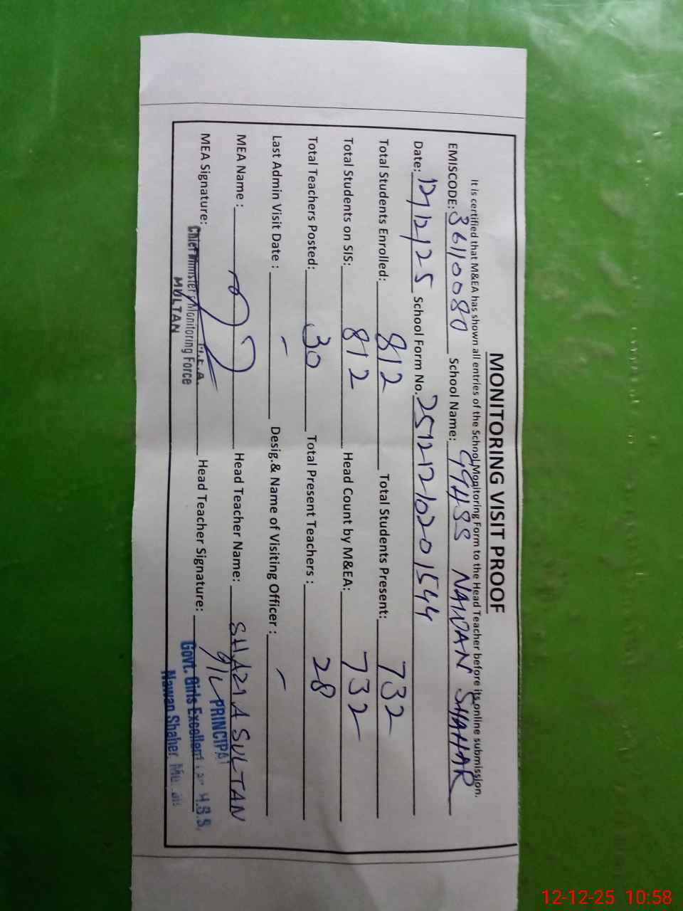 | EMIS Code: 36110080 | Name of School: GGHSS NAWAN SHAHER (ATTACH WITH GCET (W) MULTAN) | |||
