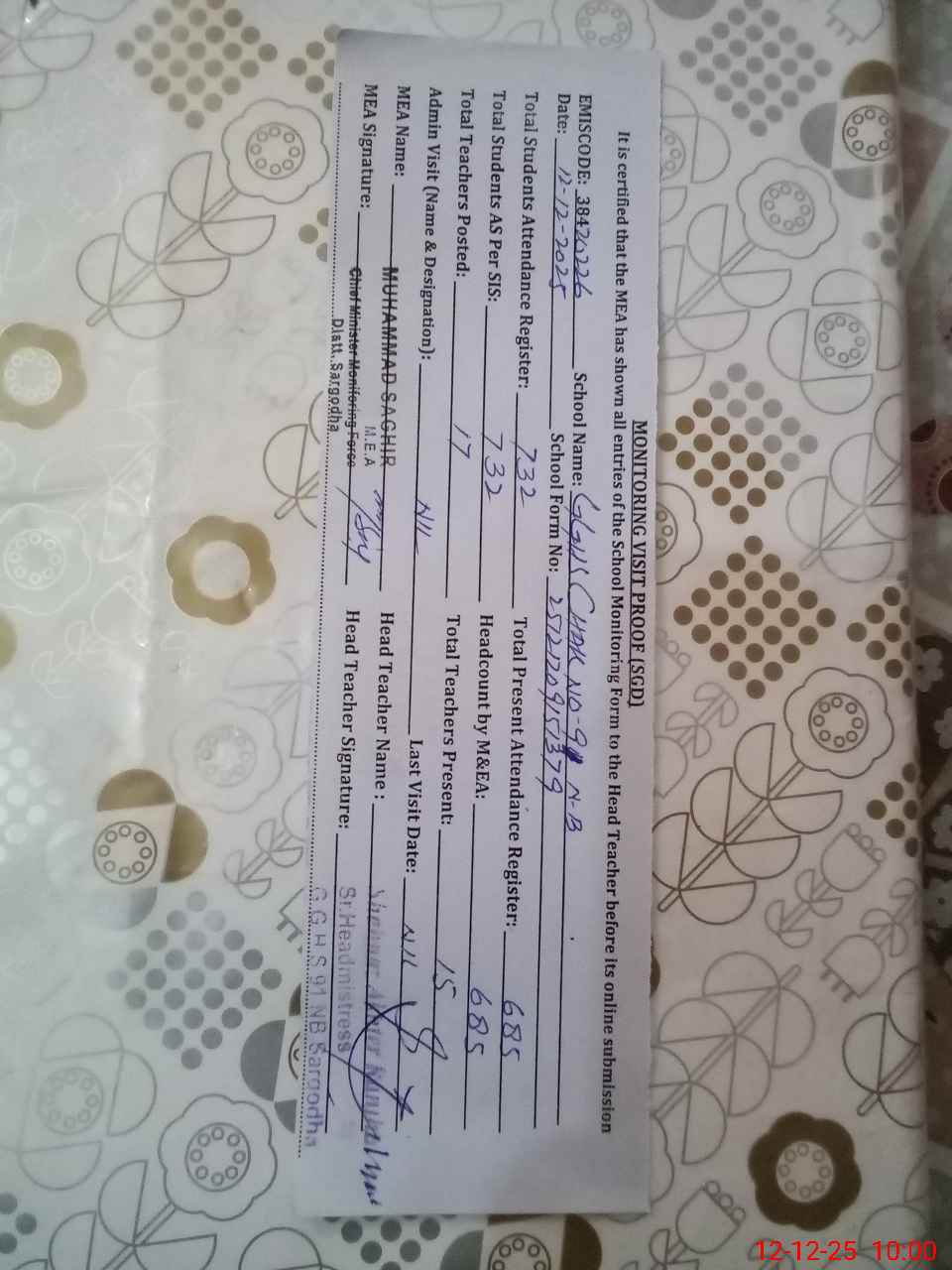 | Attendance Register | Head Teacher | MEA with School | Visit Proof |