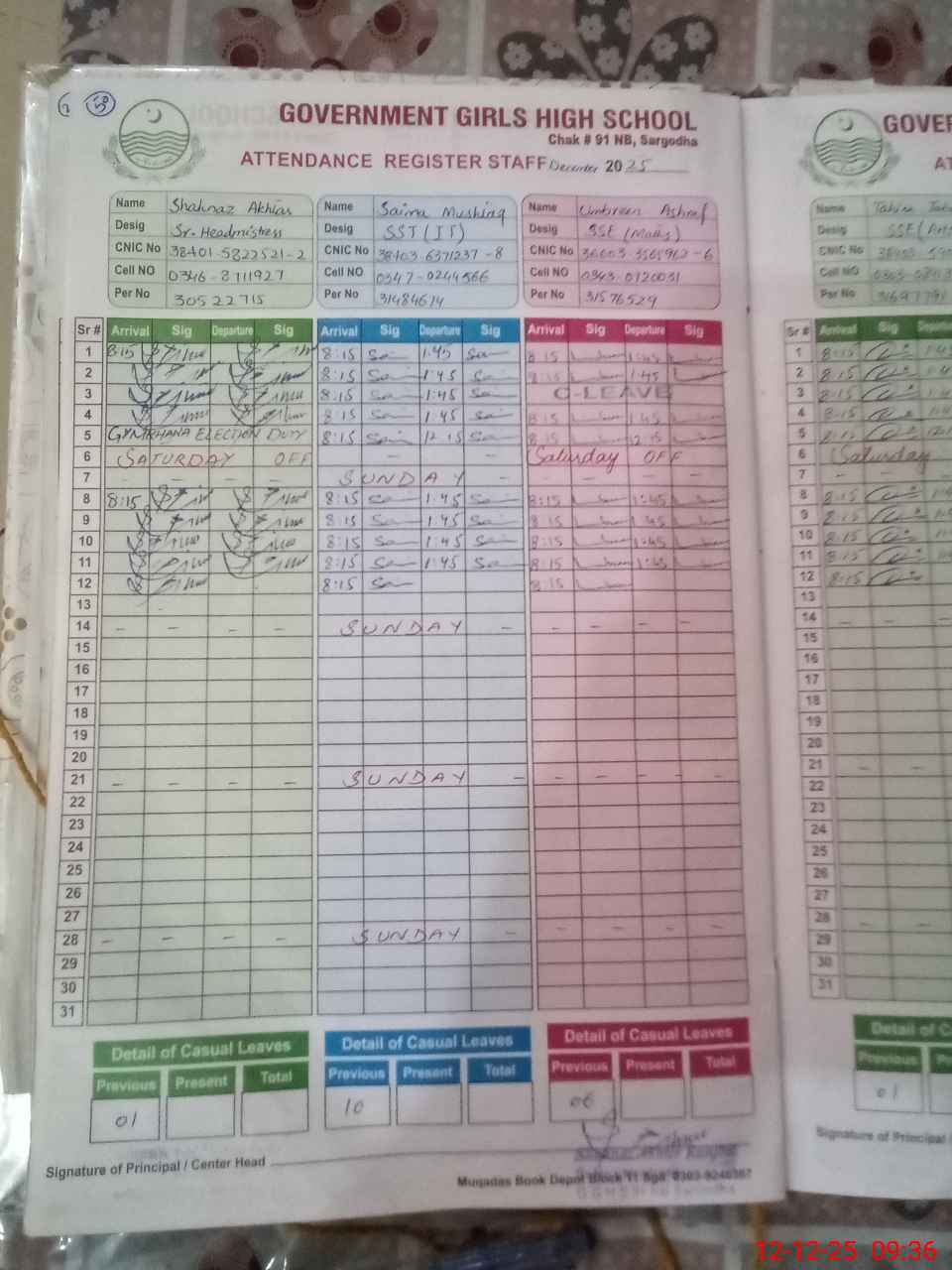 | CNIC | Full Name | Designation | R/C | Absence During Last Calender Month |