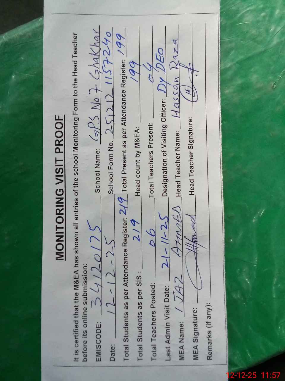 | Attendance Register | Head Teacher | MEA with School | Visit Proof |