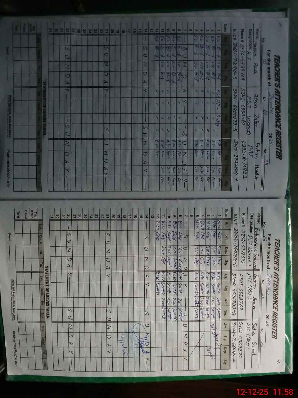 | CNIC | Full Name | Designation | R/C | Absence During Last Calender Month |