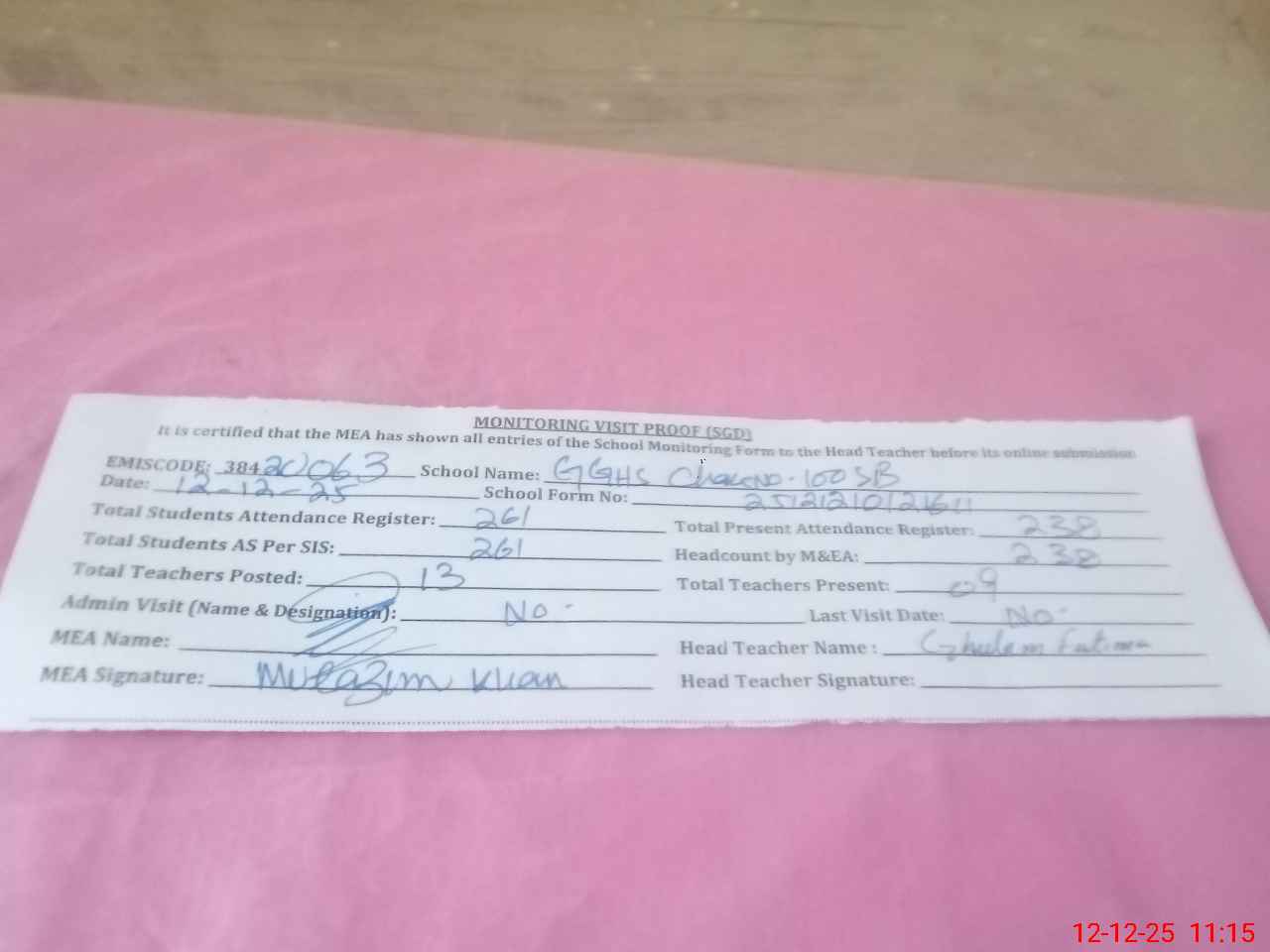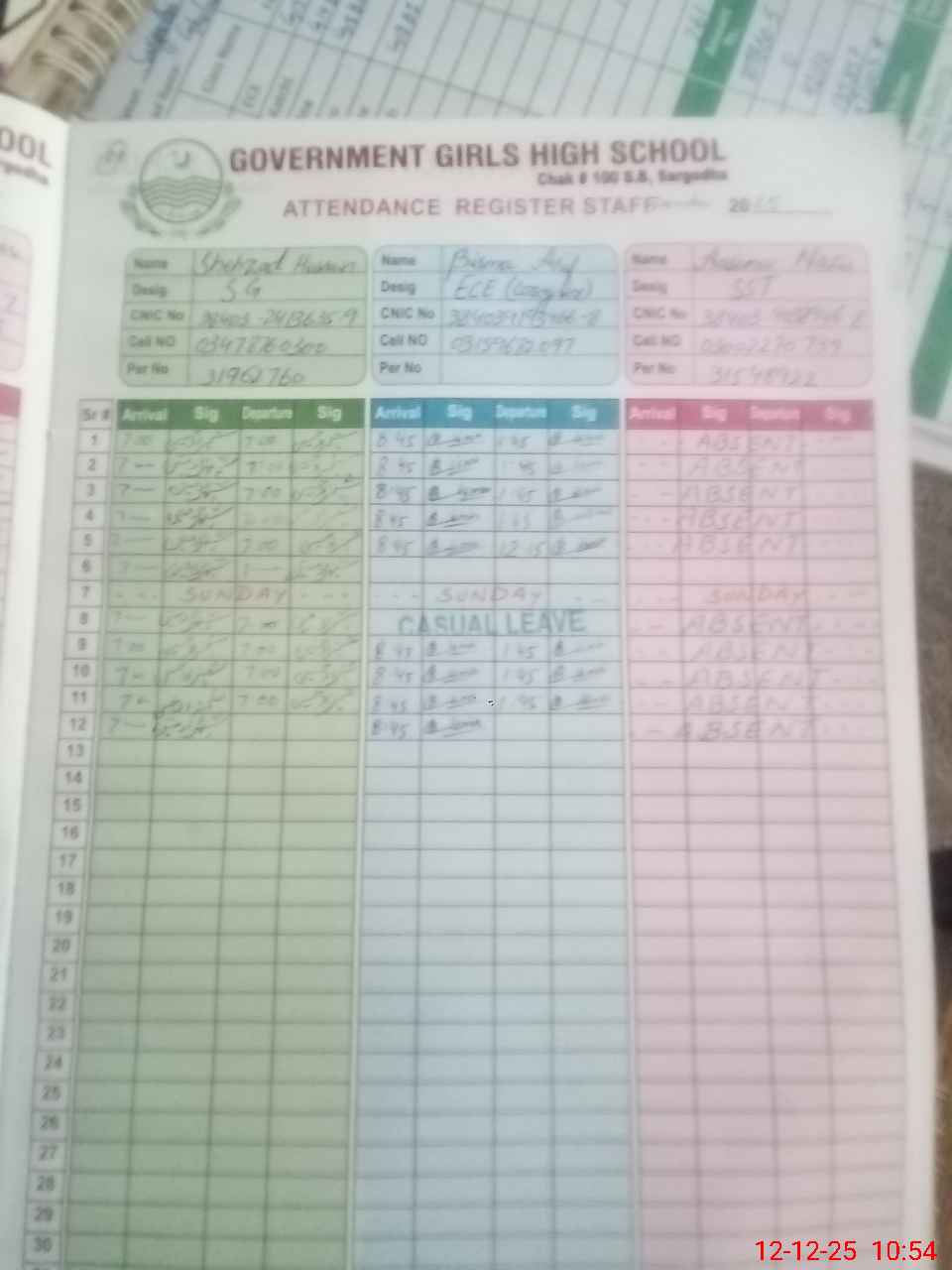 | Remarks (Use Separate Page if Required): SST Asima Nazeer CNIC no 3840340389468 absent from August 2025 | |||||