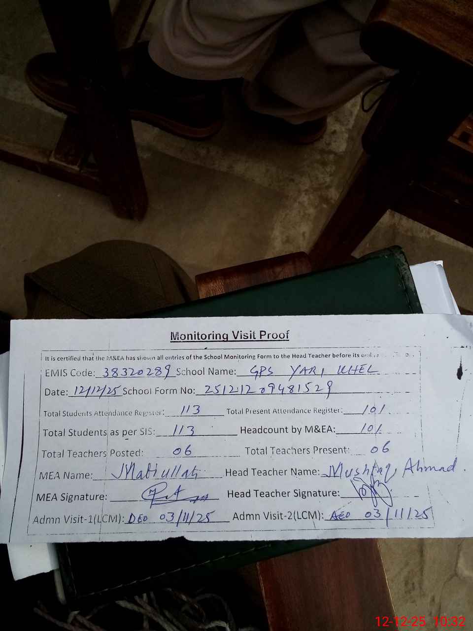 | Attendance Register | Head Teacher | MEA with School | Visit Proof |