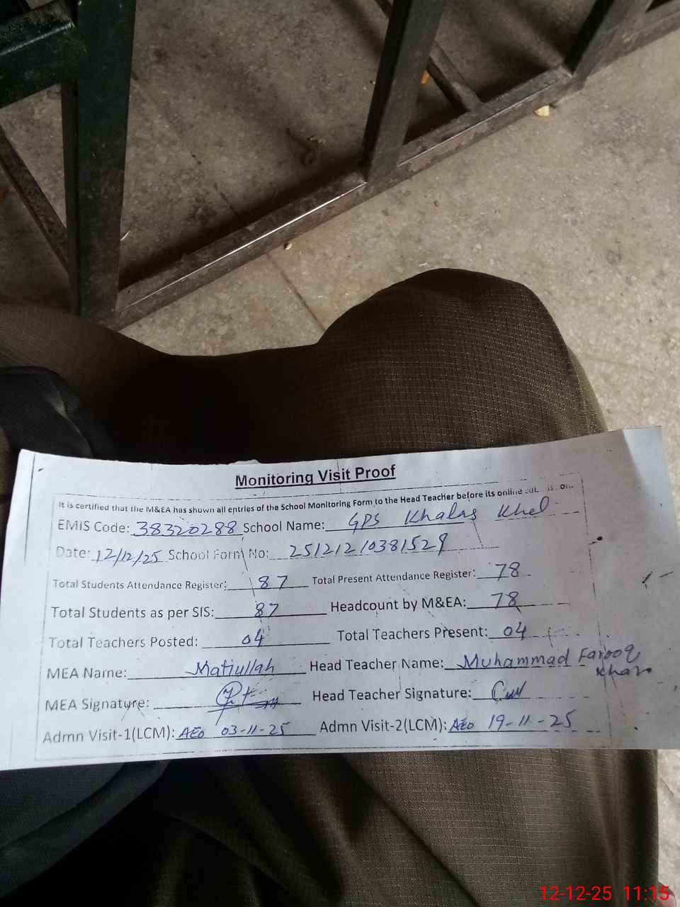 | EMIS Code: 38320288 | Name of School: GPS KHALAS KHEL | |||
