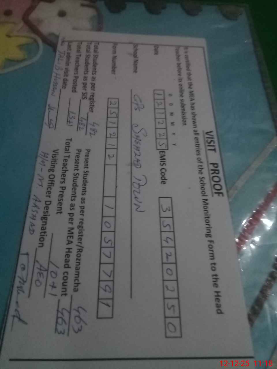 | Attendance Register | Head Teacher | MEA with School | Visit Proof |