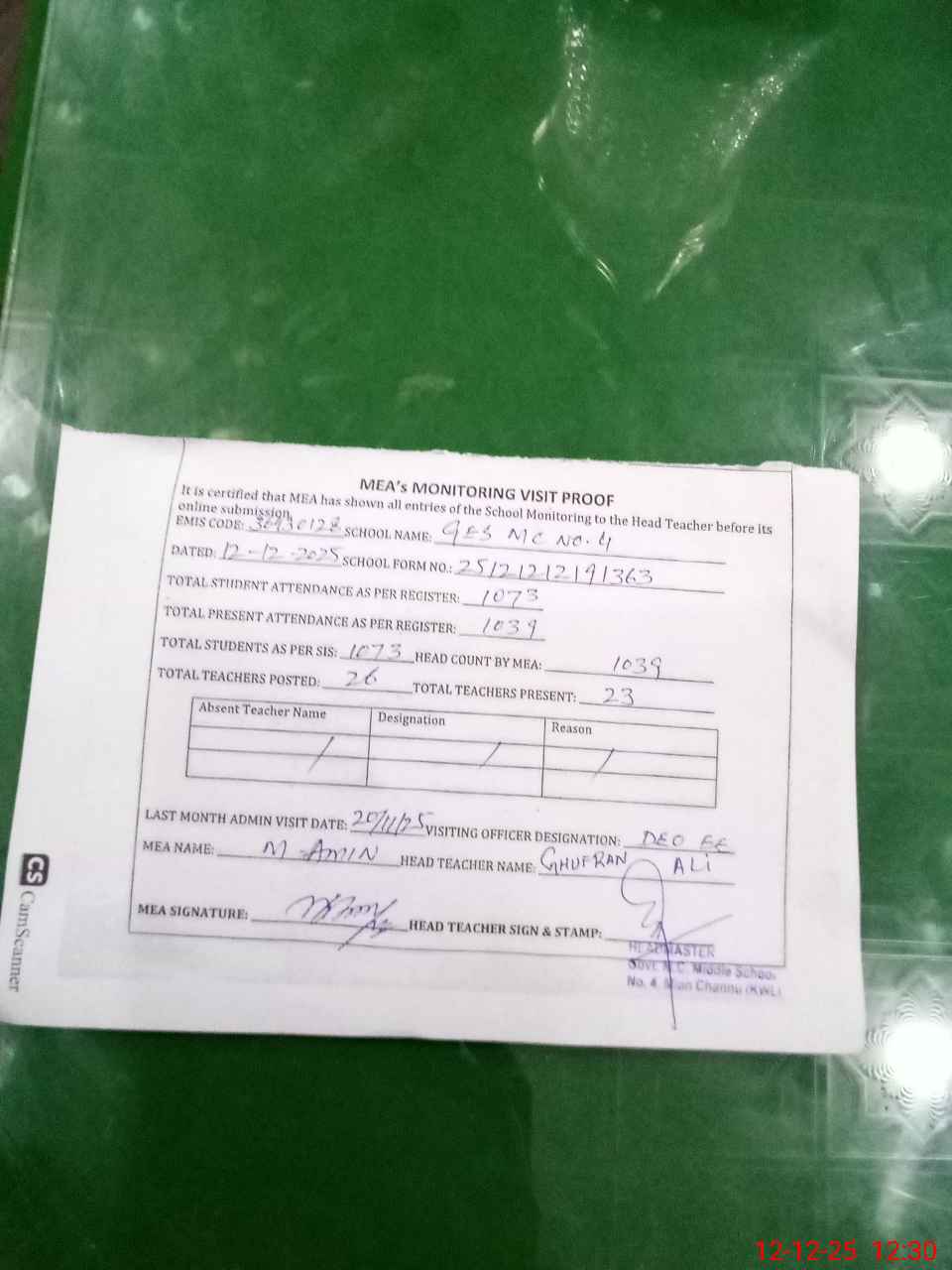 | Attendance Register | Head Teacher | MEA with School | Visit Proof |