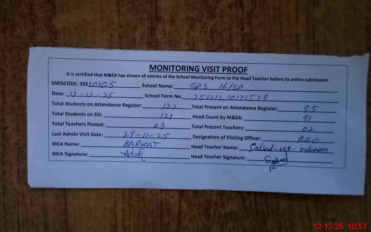 | EMIS Code: 39210105 | Name of School: GPS 16/SP PO PAKPATTAN | |||