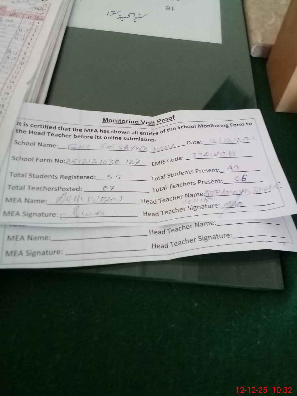 | Attendance Register | Head Teacher | MEA with School | Visit Proof |