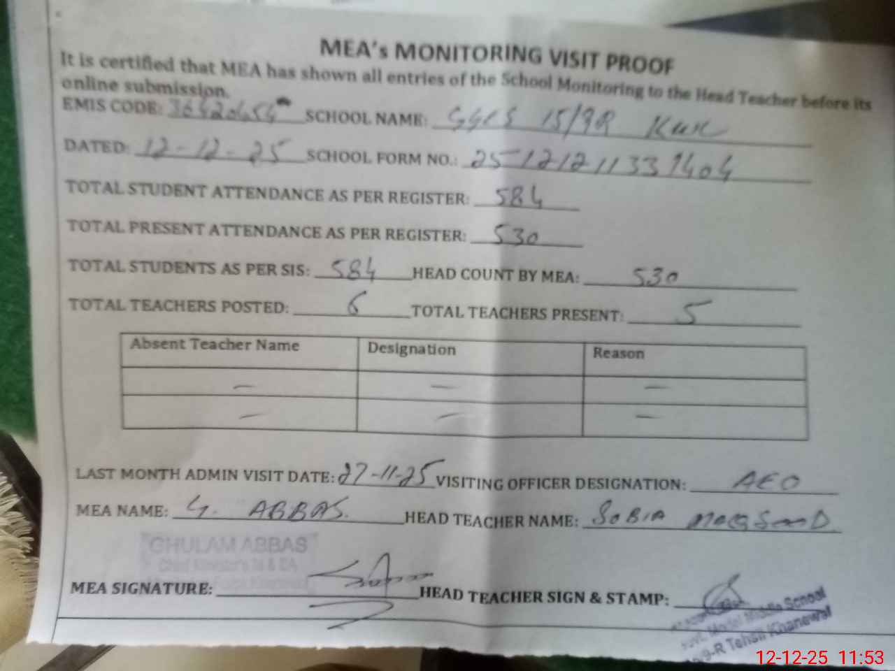 | Attendance Register | Head Teacher | MEA with School | Visit Proof |