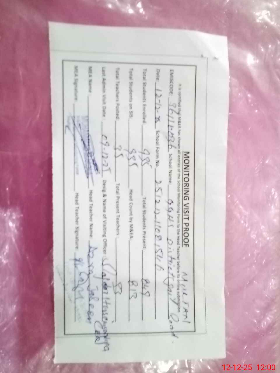 | Attendance Register | Head Teacher | MEA with School | Visit Proof |