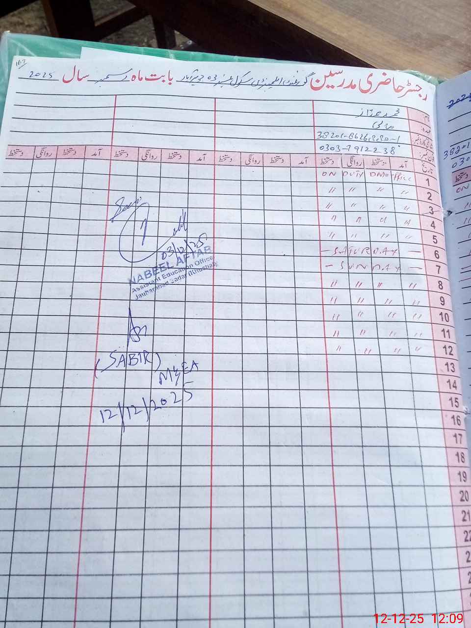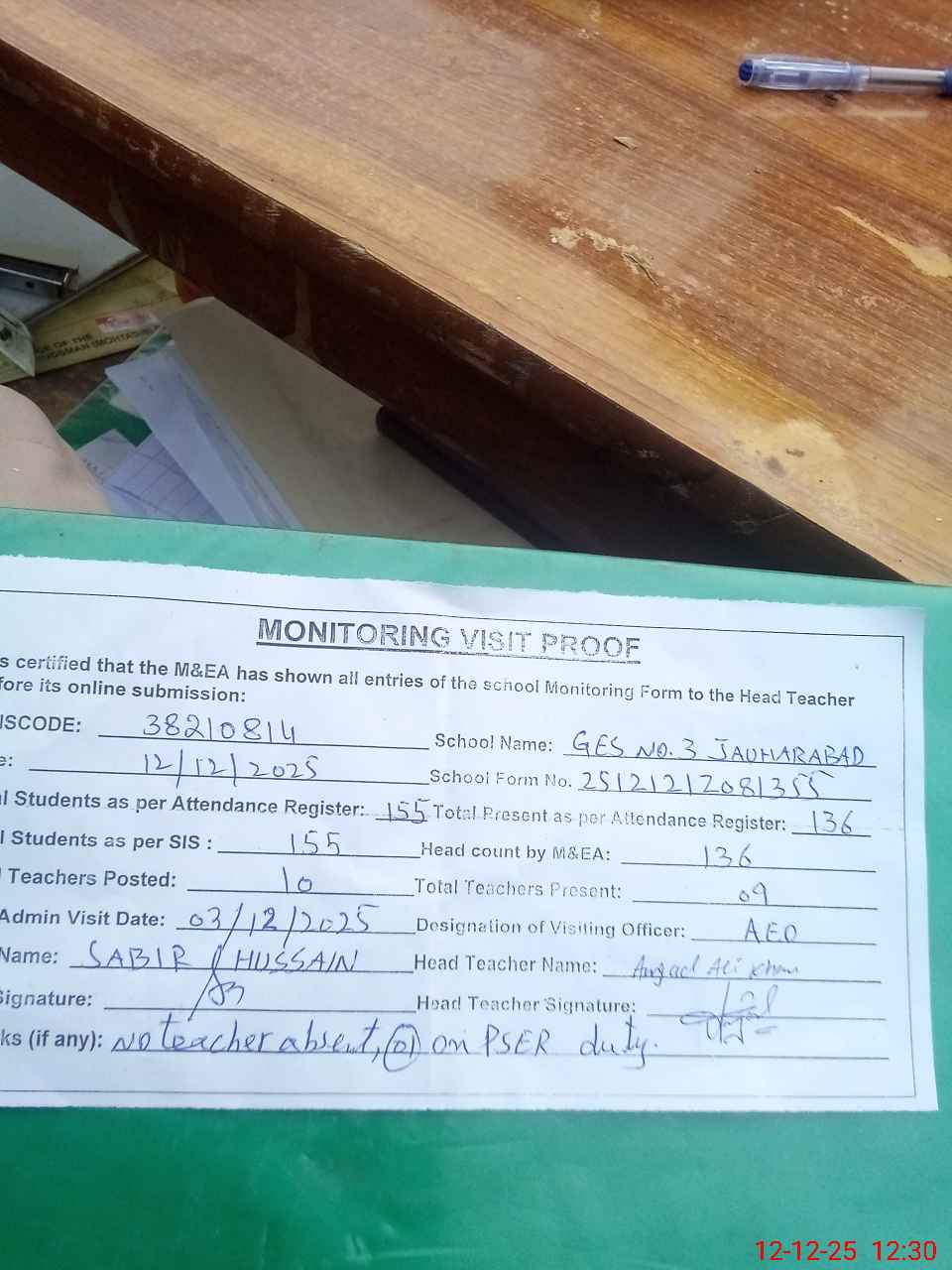 | Remarks (Use Separate Page if Required): no teacher absent total students on register 155 total students on SiS 155 present students are 136 last admin visit by AEO on 03 Dec 2025 | |||||