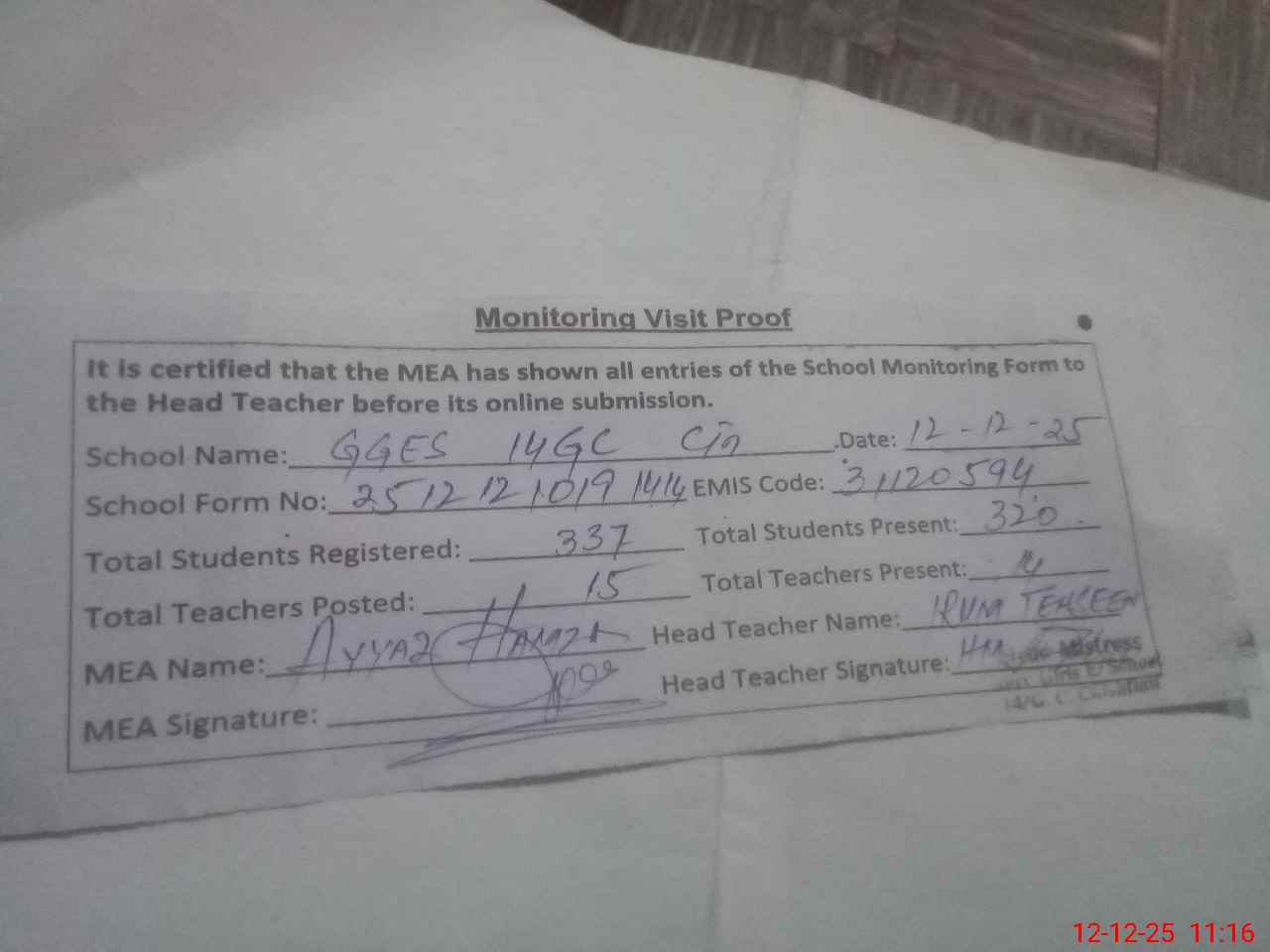 | Attendance Register | Head Teacher | MEA with School | Visit Proof |