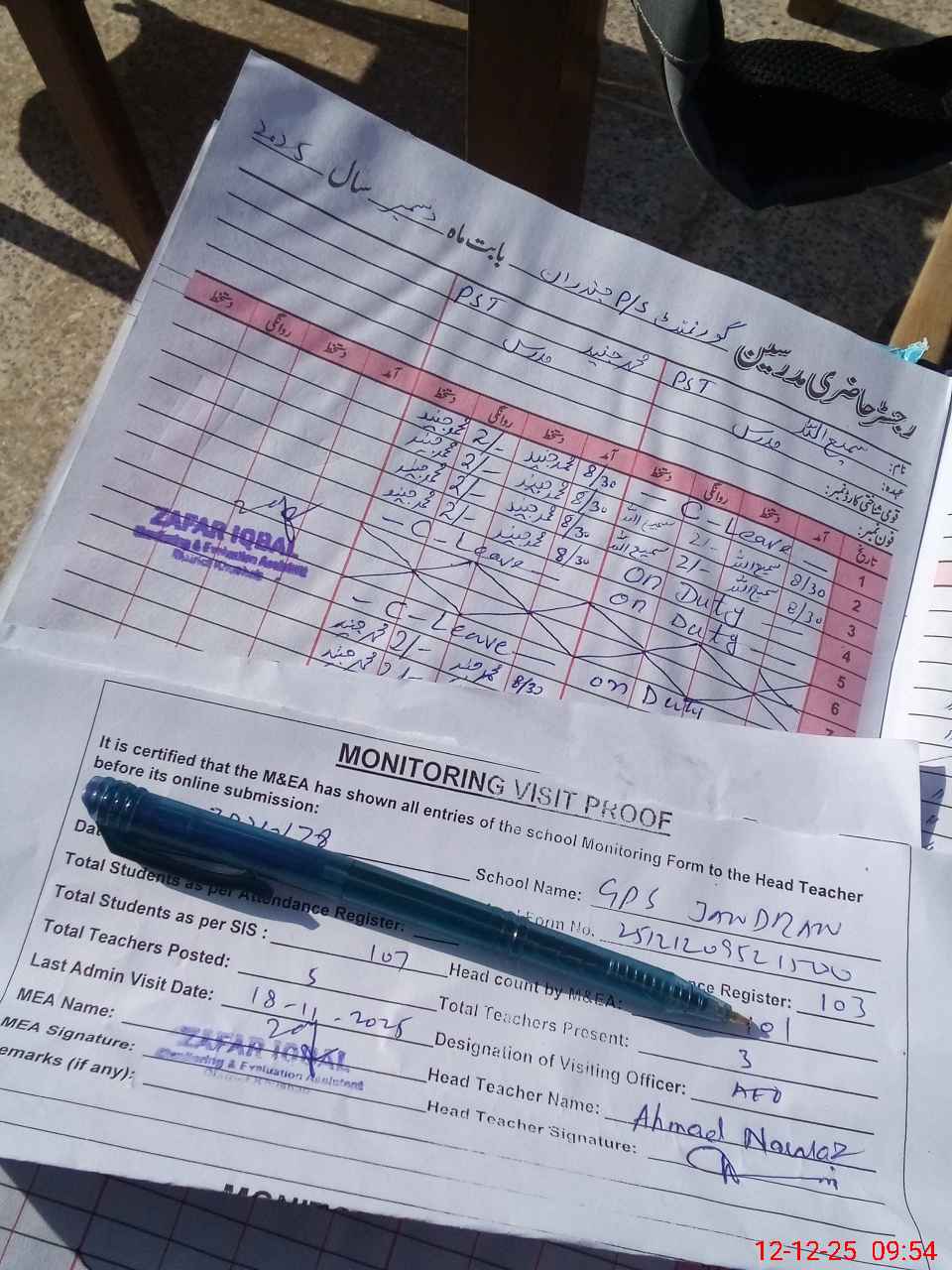 | Attendance Register | Head Teacher | MEA with School | Visit Proof |