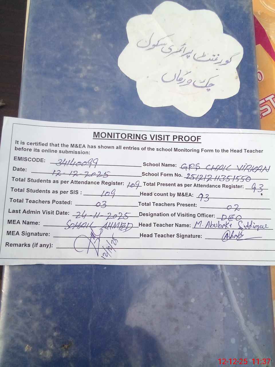 | Attendance Register | Head Teacher | MEA with School | Visit Proof |
