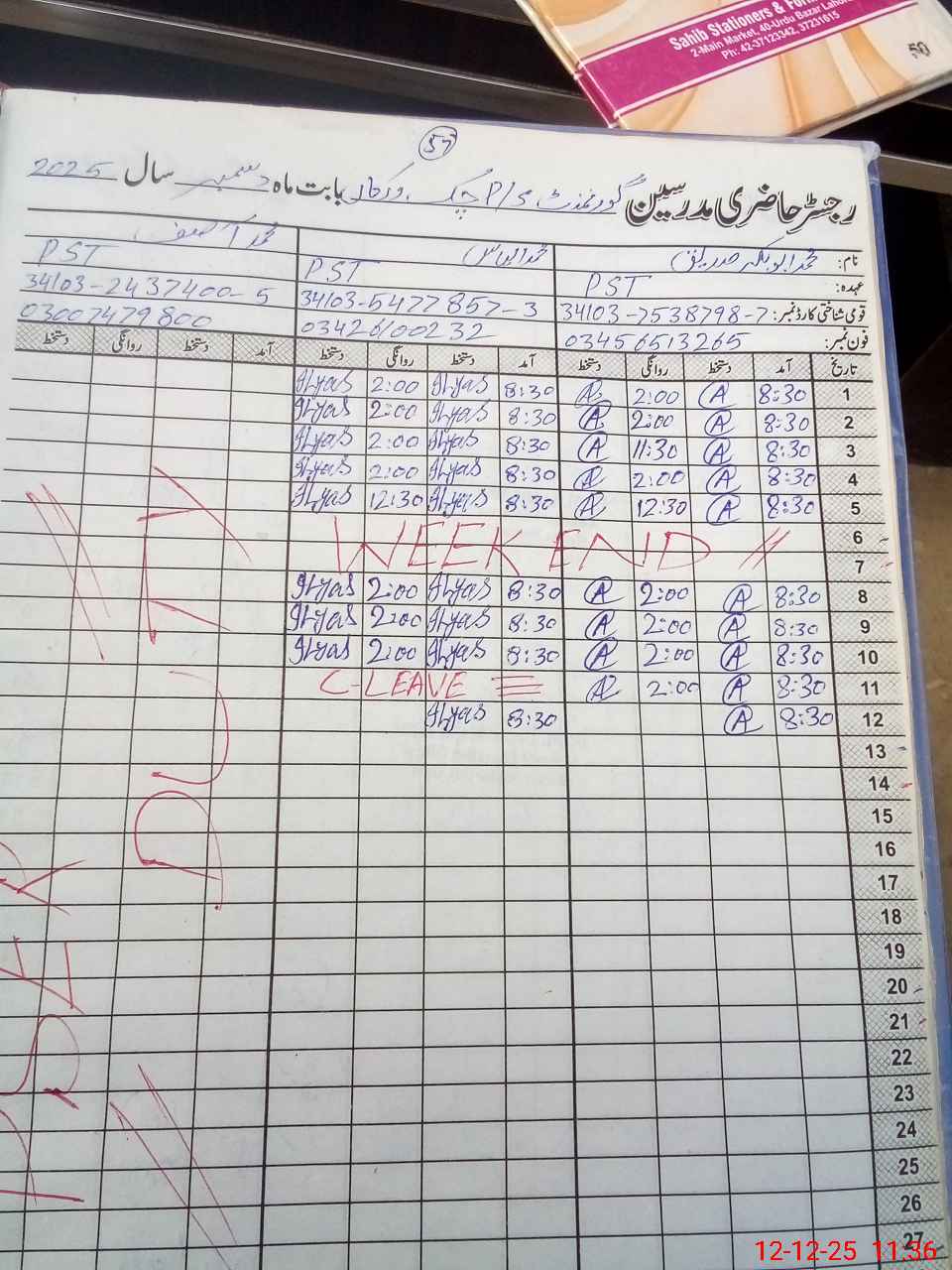 | CNIC | Full Name | Designation | R/C | Absence During Last Calender Month |