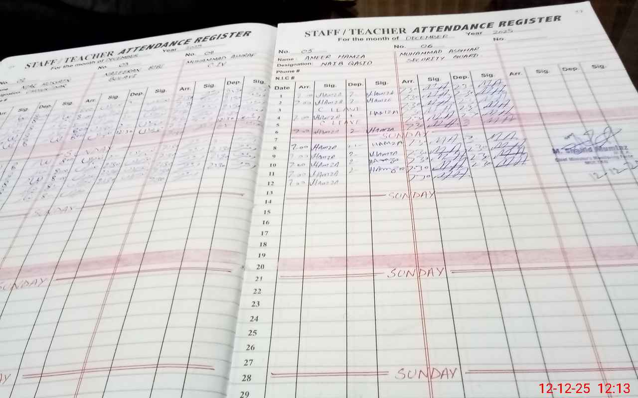 | CNIC | Full Name | Designation | R/C | Absence During Last Calender Month |