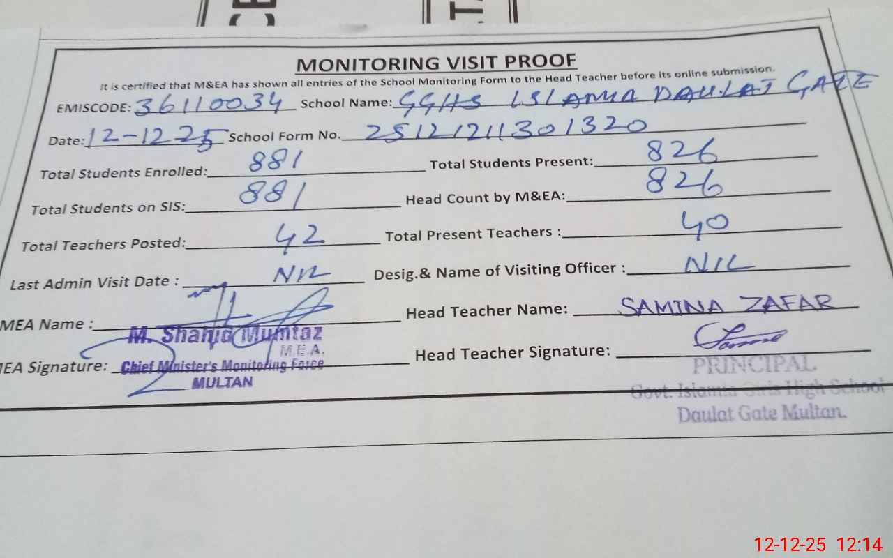| EMIS Code: 36110034 | Name of School: GGHS ISLAMIA DOULAT GATE MULTAN | |||