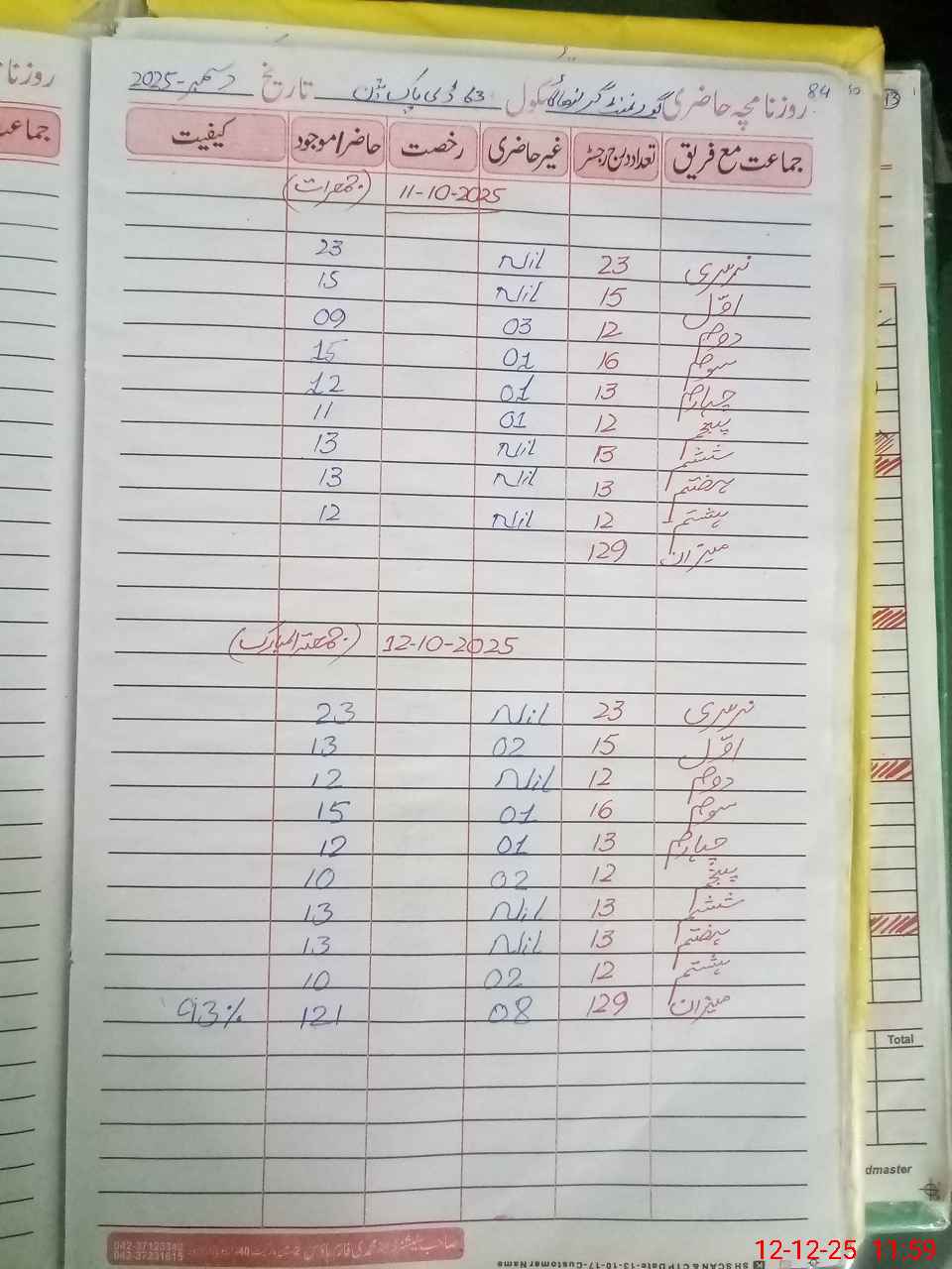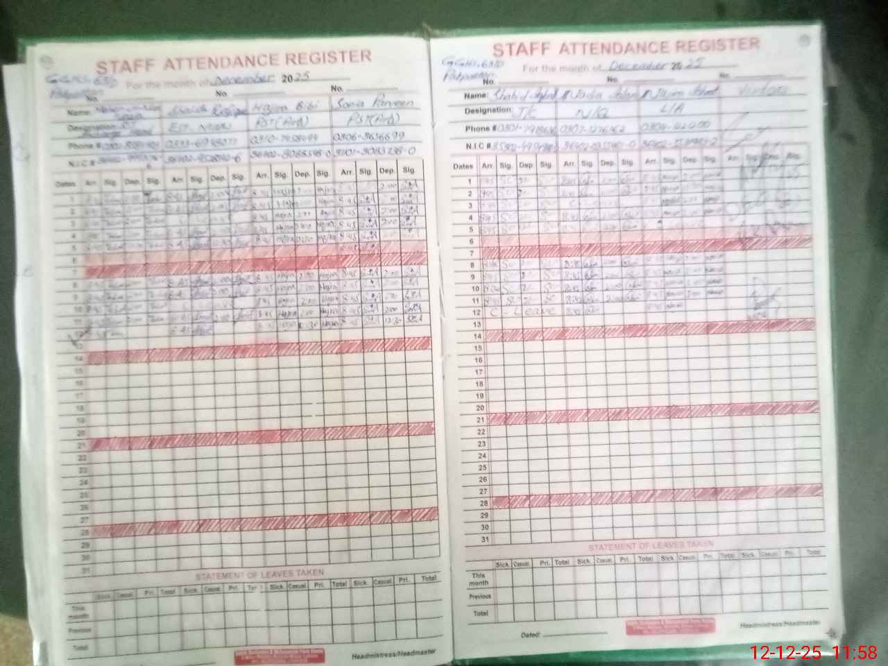 | CNIC | Full Name | Designation | R/C | Absence During Last Calender Month |