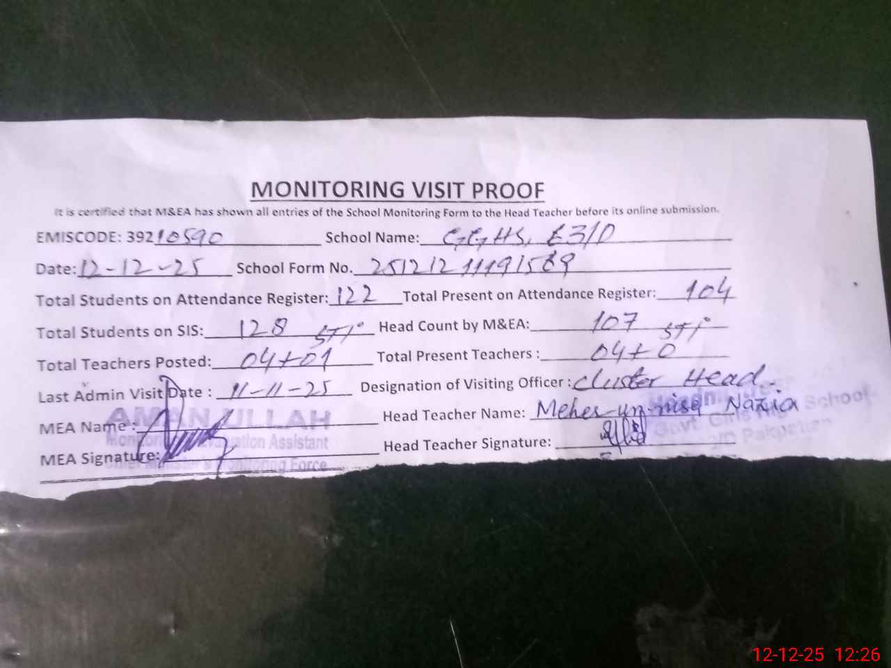 | Attendance Register | Head Teacher | MEA with School | Visit Proof |