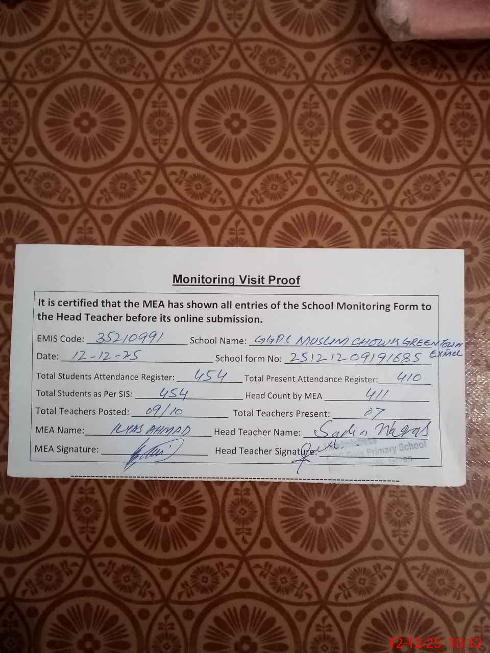 | Attendance Register | Head Teacher | MEA with School | Visit Proof |