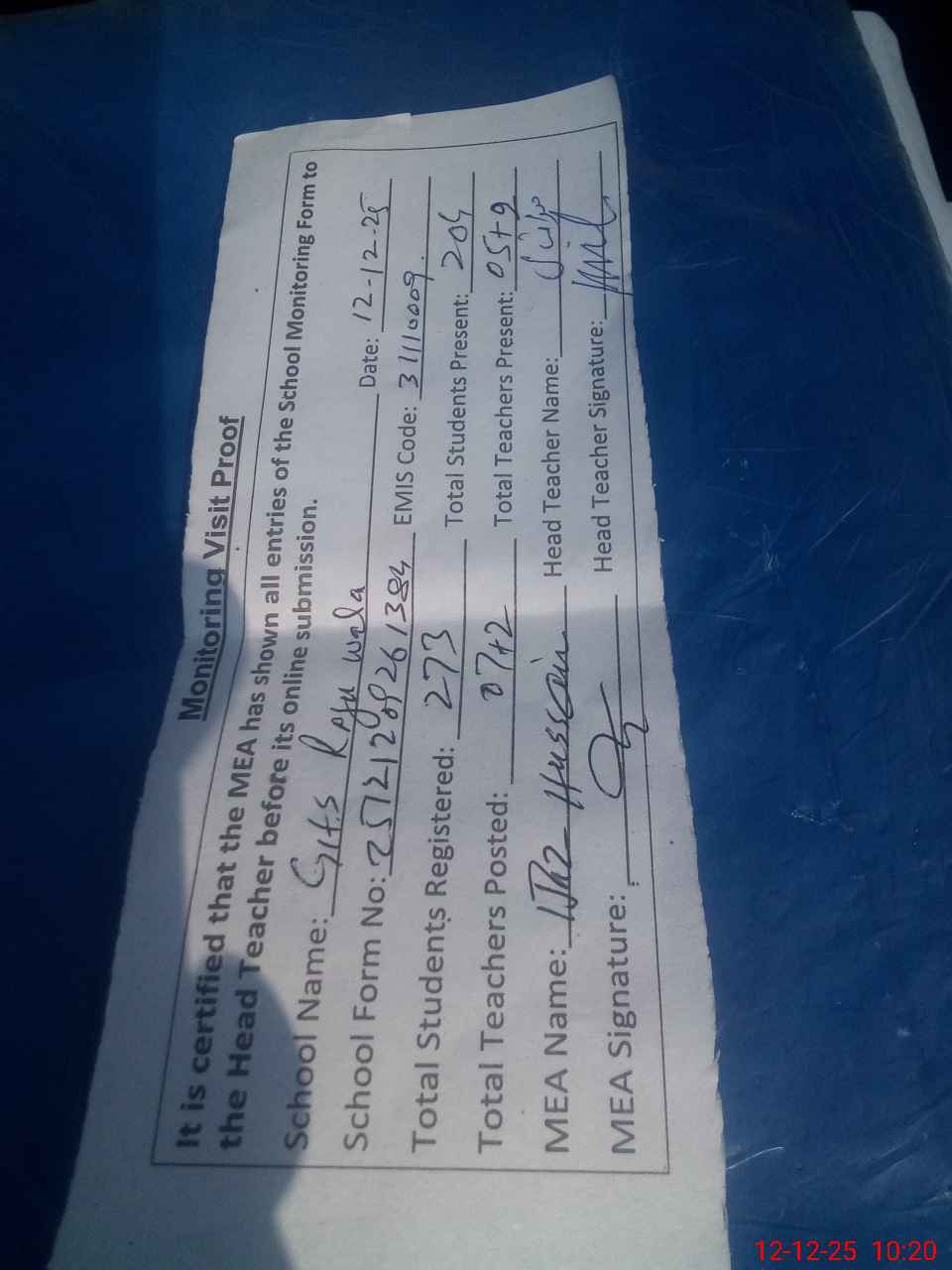 | Attendance Register | Head Teacher | MEA with School | Visit Proof |