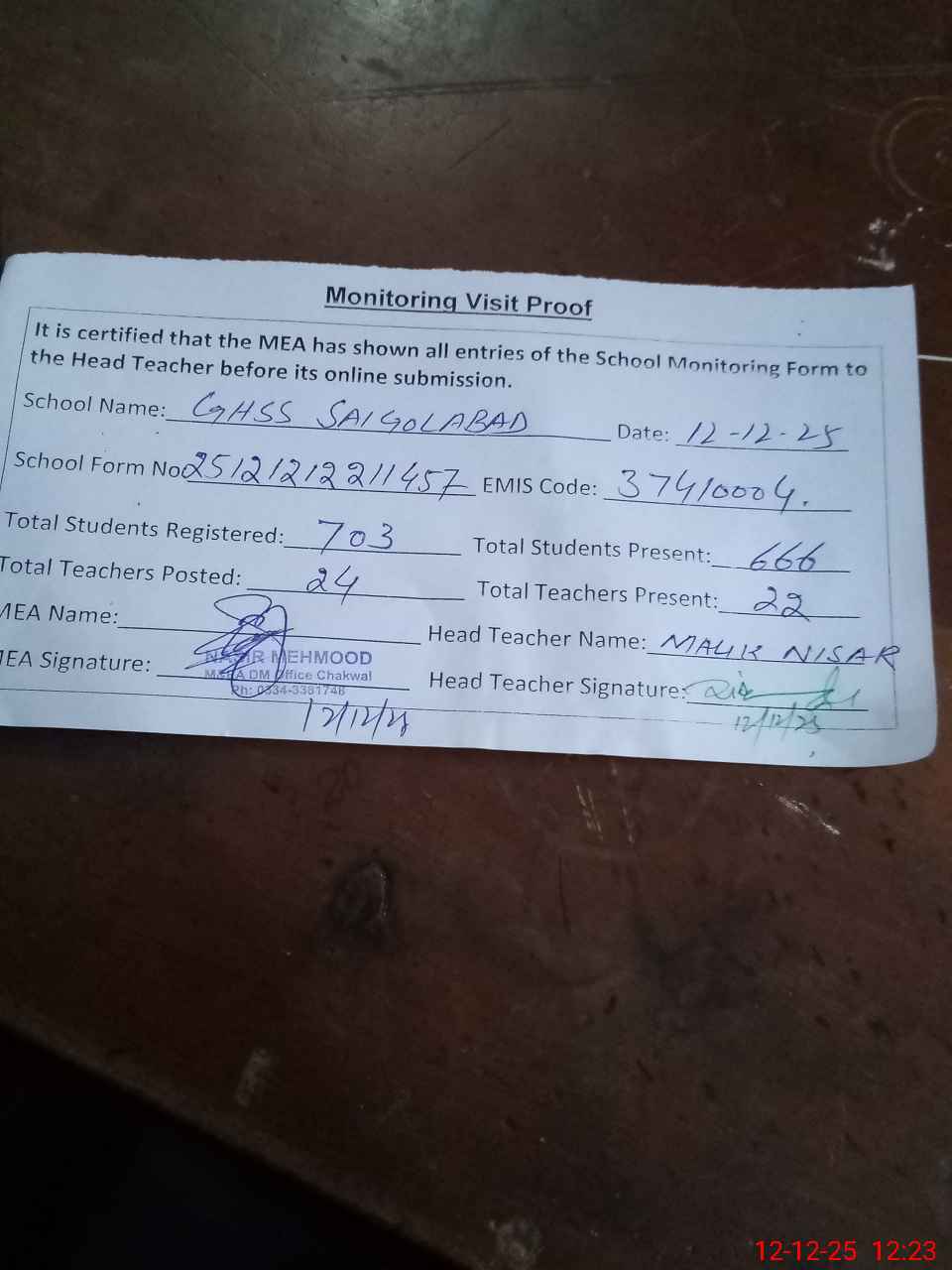 | Attendance Register | Head Teacher | MEA with School | Visit Proof |