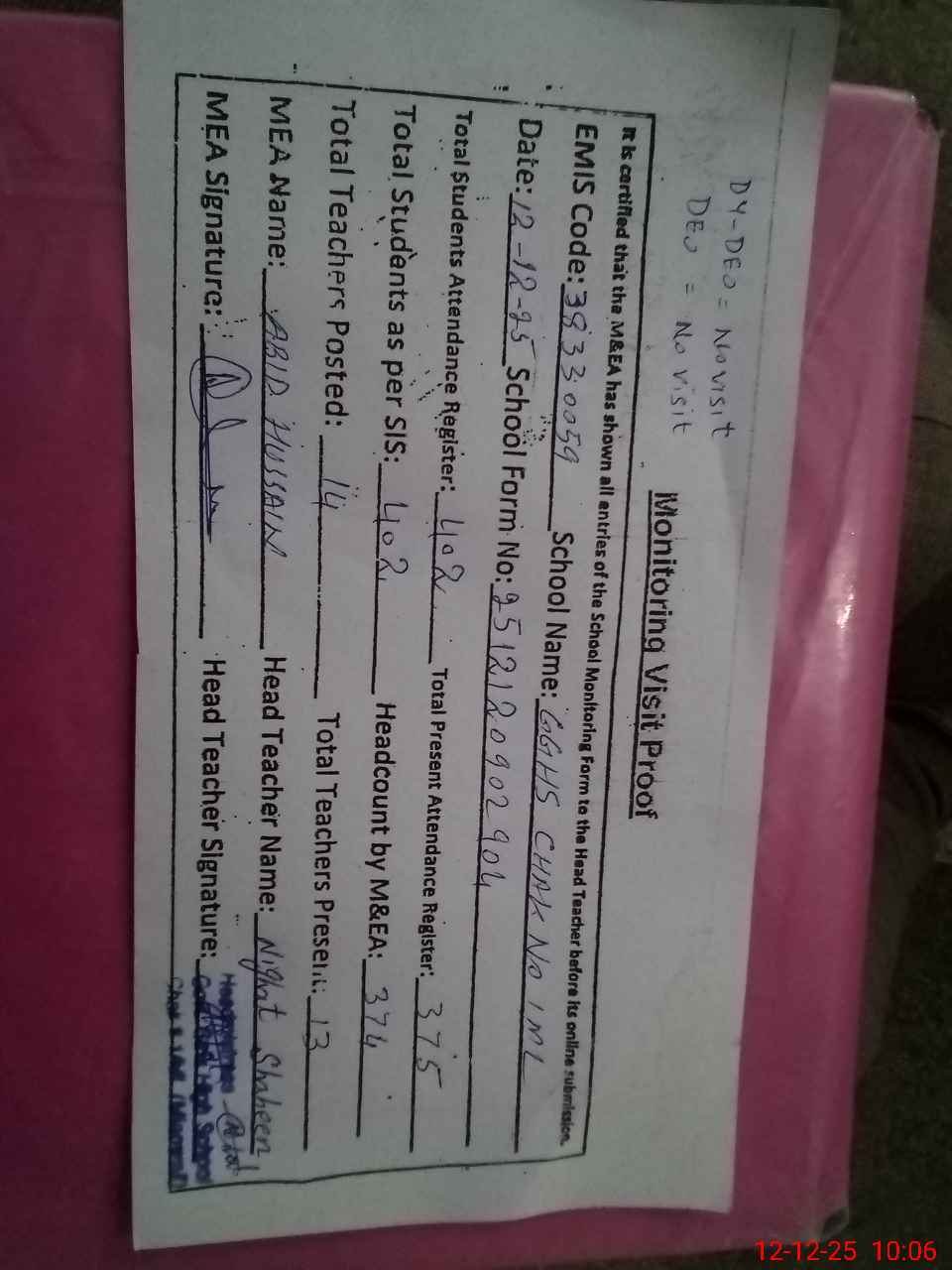 | Remarks (Use Separate Page if Required): No visit by Deo ceo | |||||