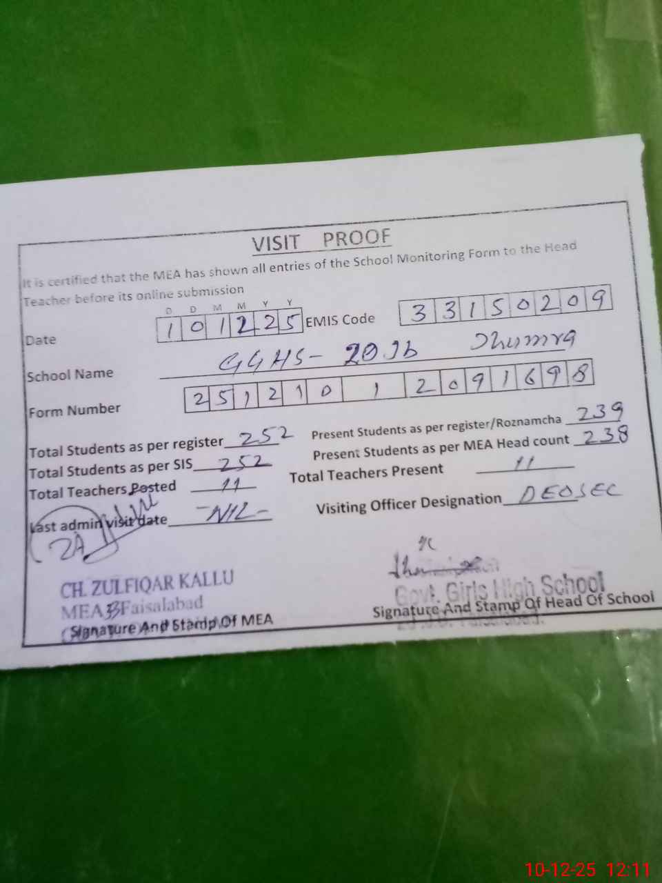 | EMIS Code: 33150209 | Name of School: GGHS CHAK NO. 20 JB | |||
