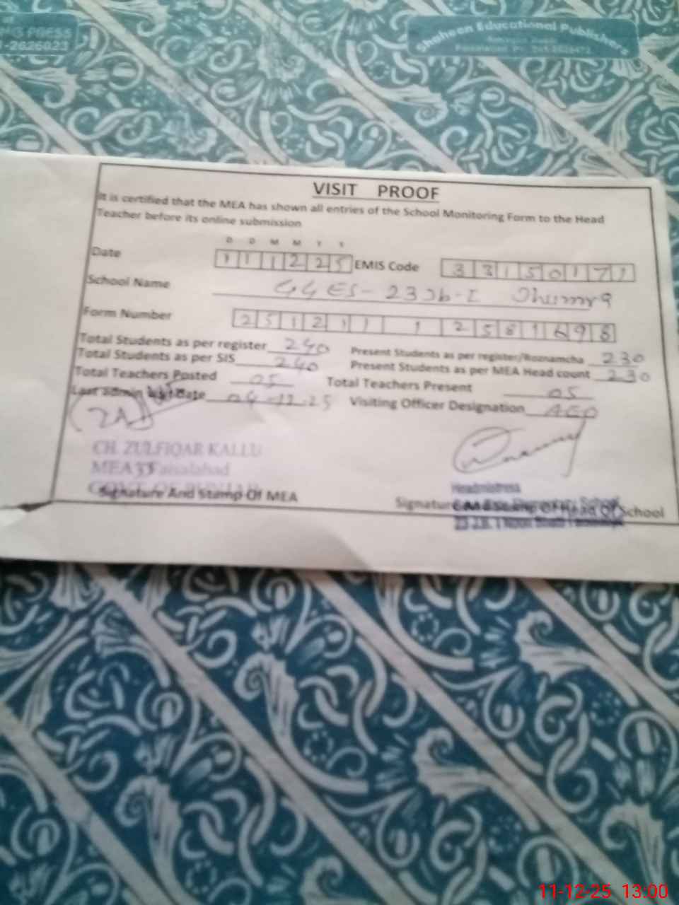 | Attendance Register | Head Teacher | MEA with School | Visit Proof |