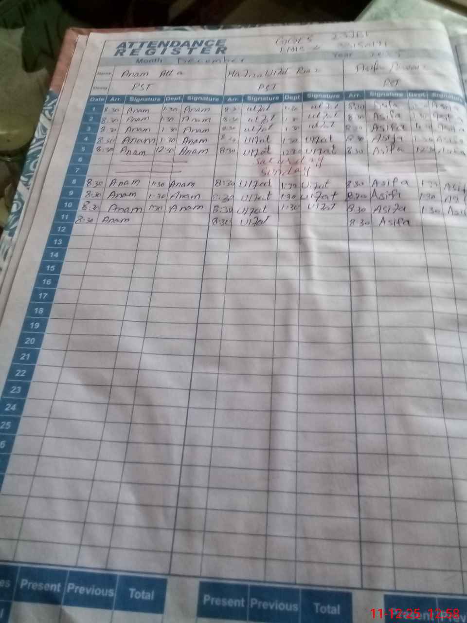 | CNIC | Full Name | Designation | R/C | Absence during last cal. month |