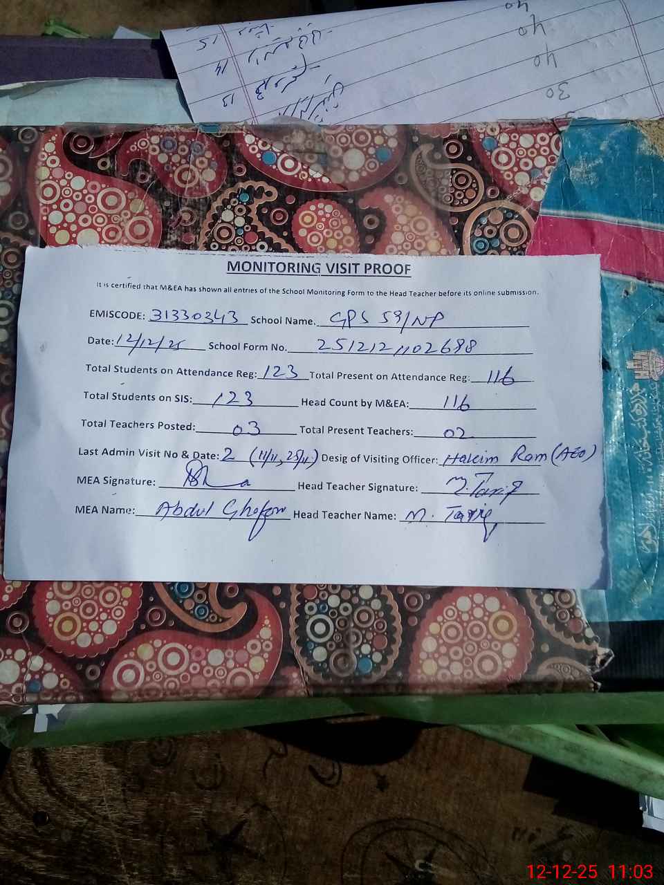 | Attendance Register | Head Teacher | MEA with School | Visit Proof |
