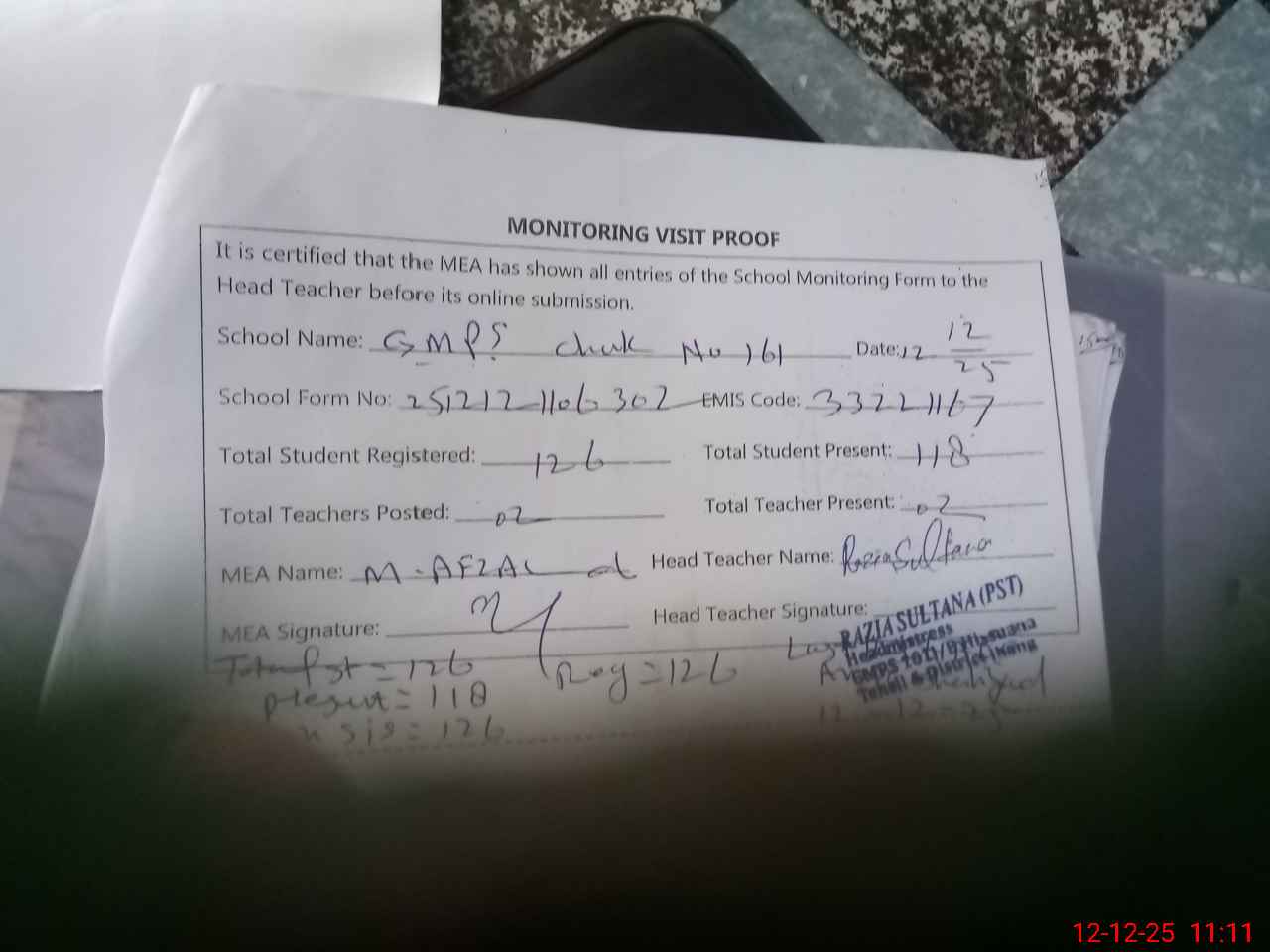 | Attendance Register | Head Teacher | MEA with School | Visit Proof |