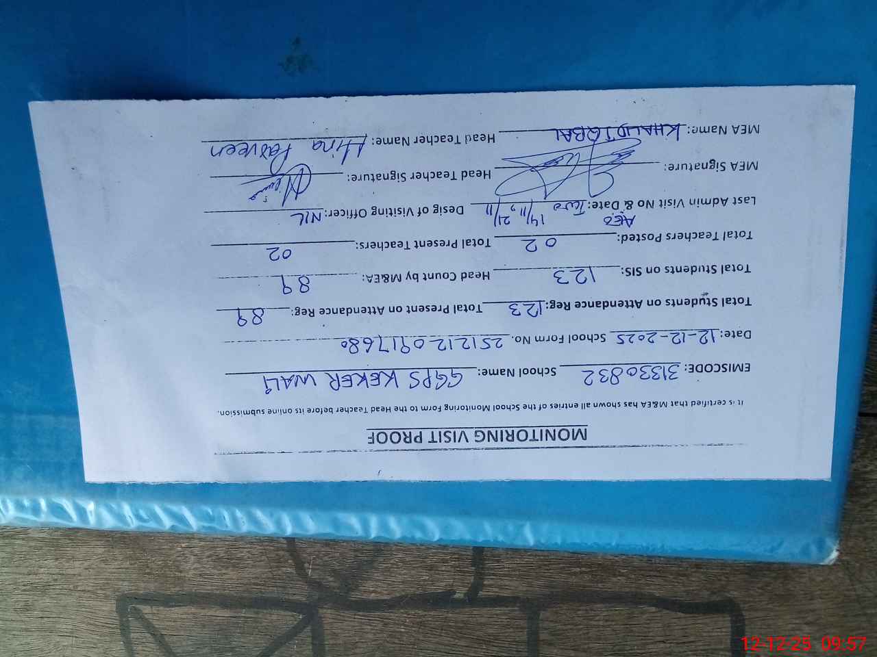 | Attendance Register | Head Teacher | MEA with School | Visit Proof |