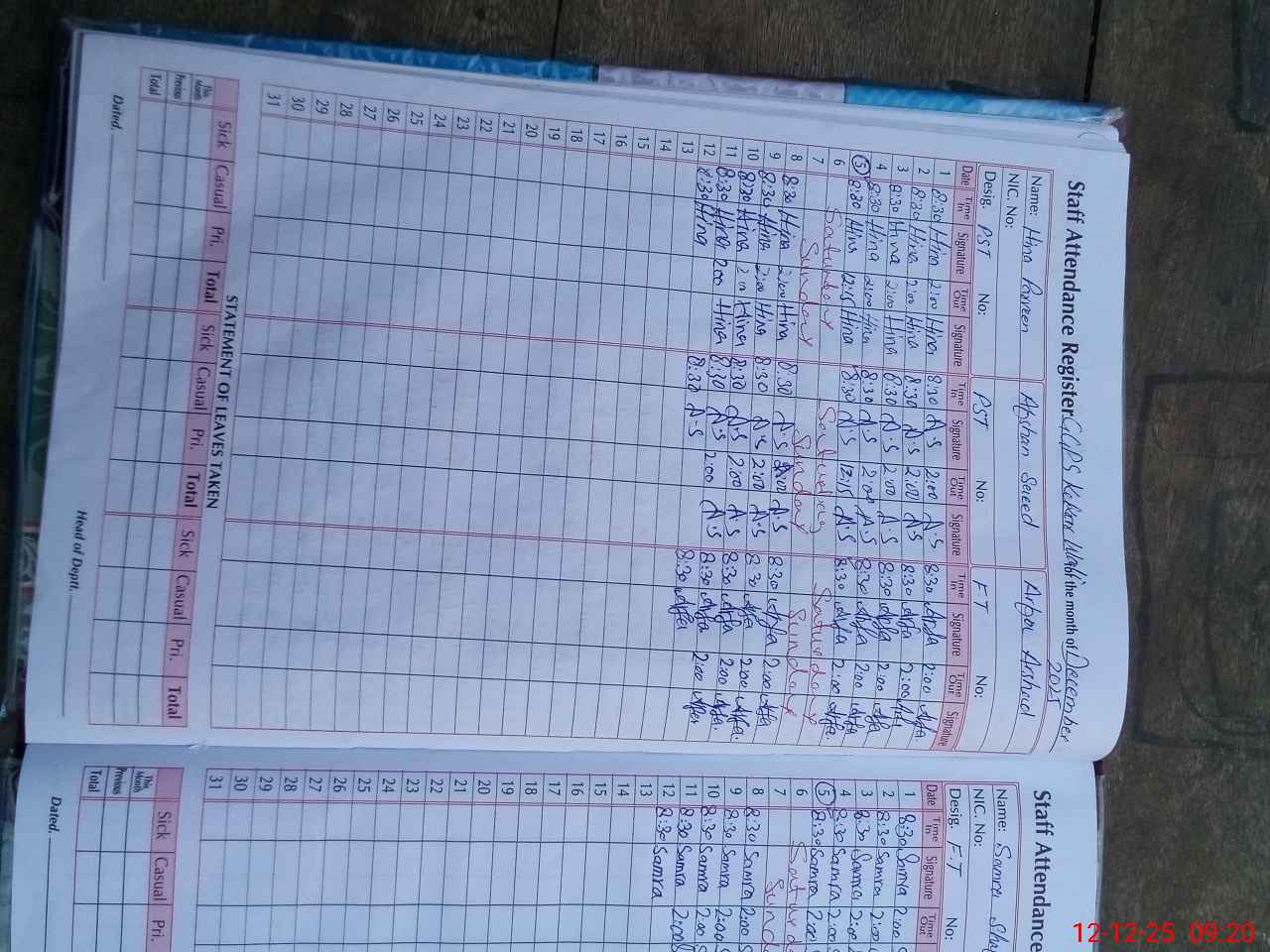 | CNIC | Full Name | Designation | R/C | Absence During Last Calender Month |