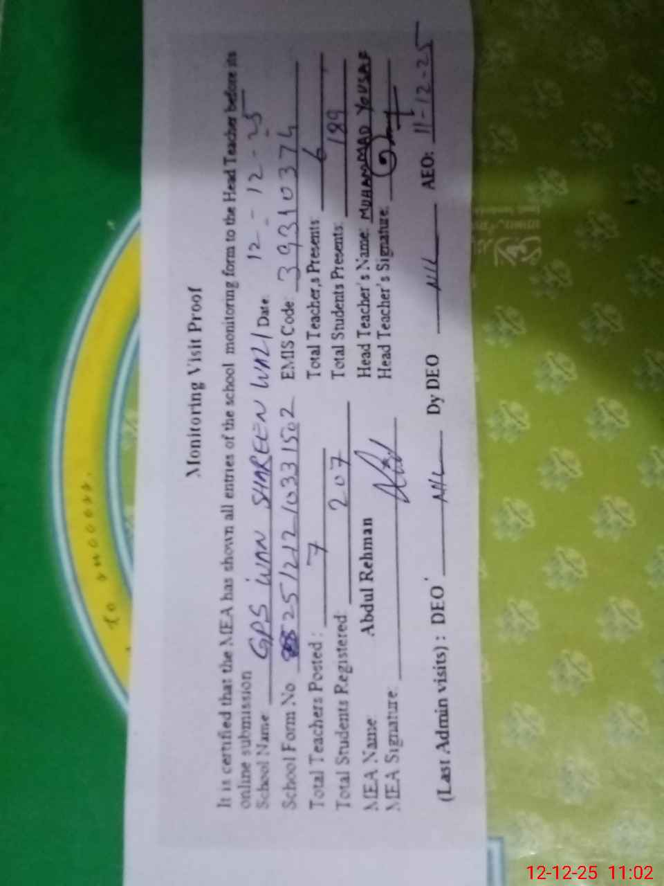 | Attendance Register | Head Teacher | MEA with School | Visit Proof |