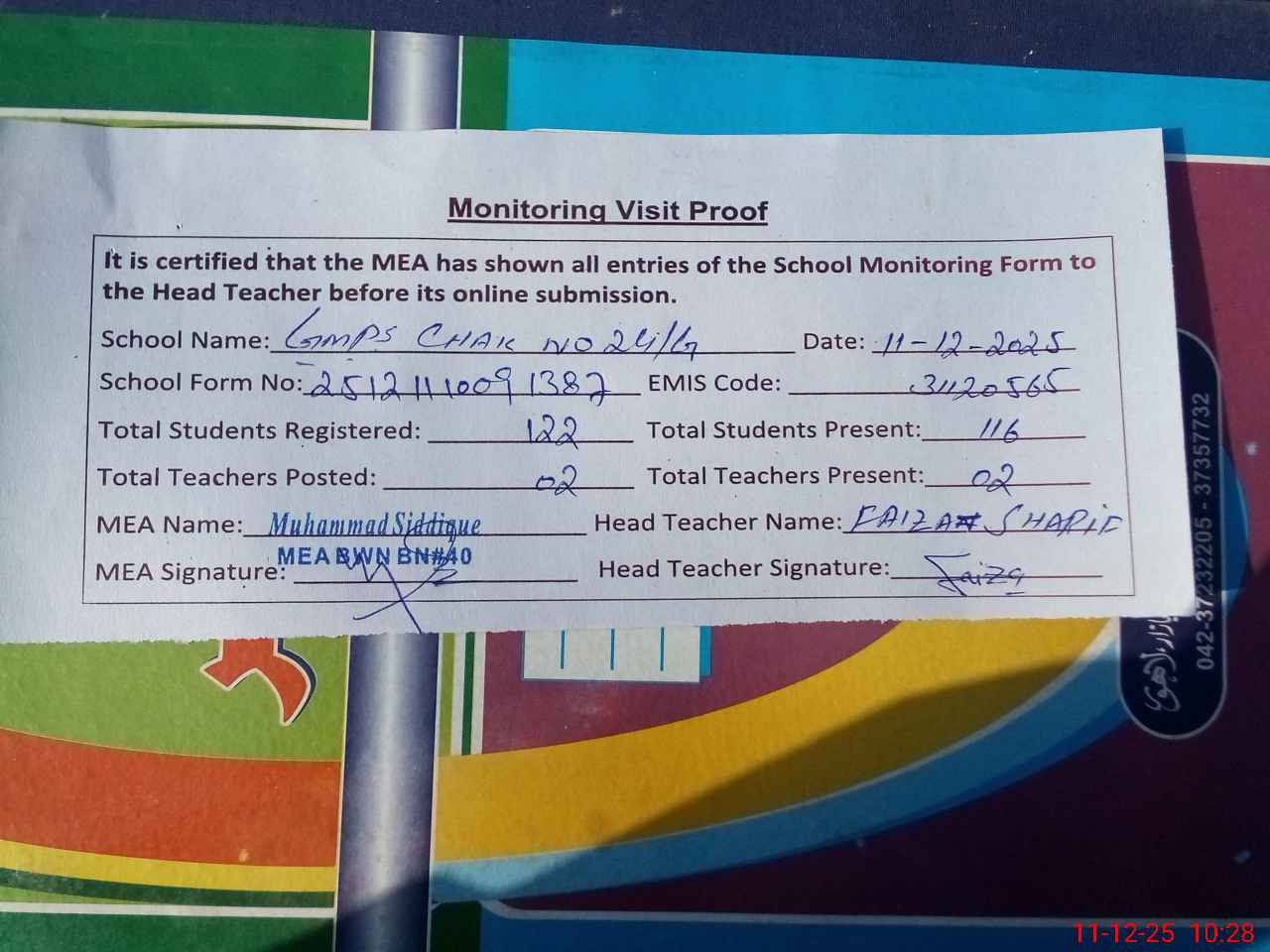 | EMIS Code: 31120565 | Name of School: GMPS CHAK NO. 24 GAJIANI | |||