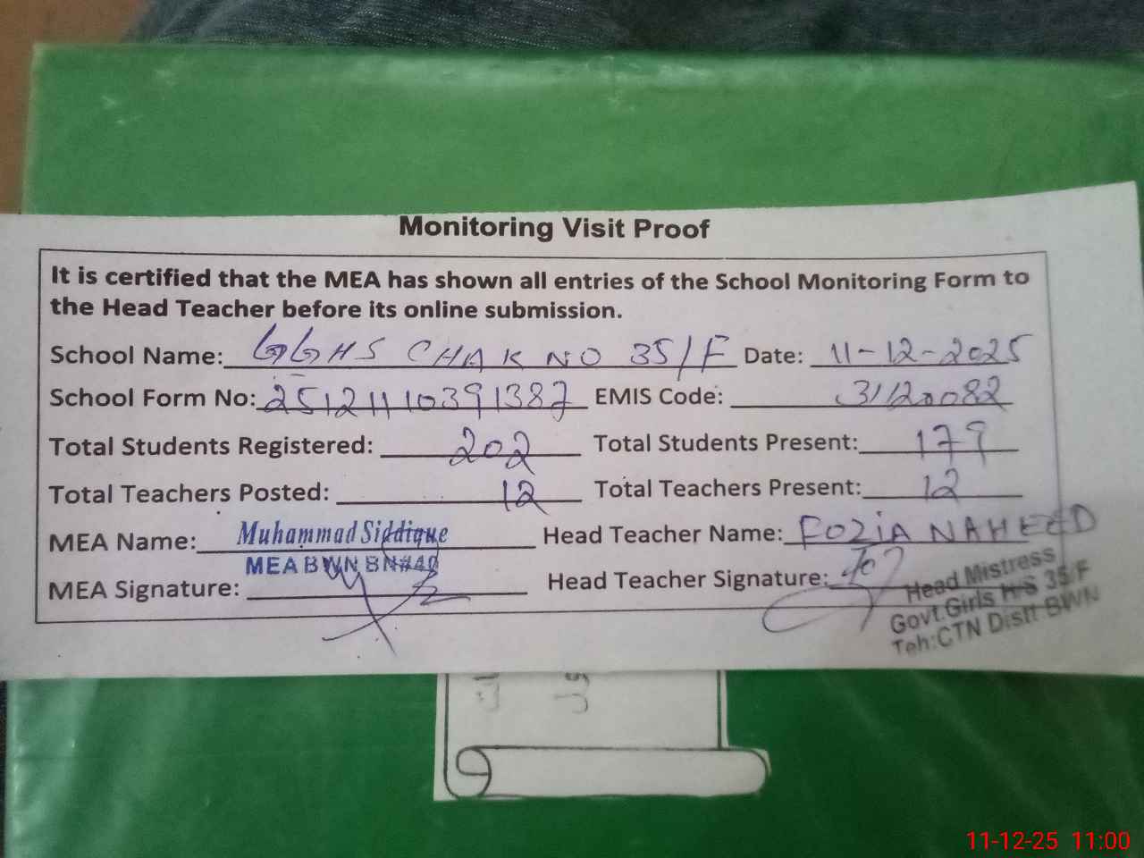 | Attendance Register | Head Teacher | MEA with School | Visit Proof |