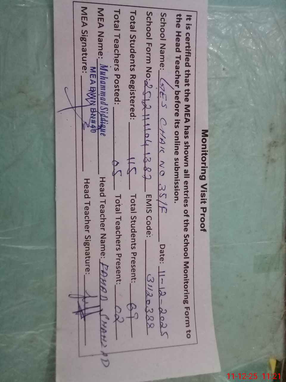 | Attendance Register | Head Teacher | MEA with School | Visit Proof |