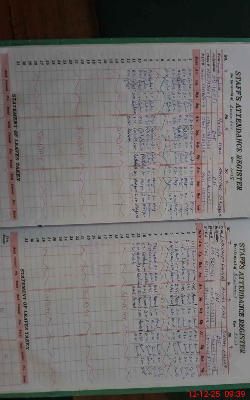 | CNIC | Full Name | Designation | R/C | Absence During Last Calender Month |