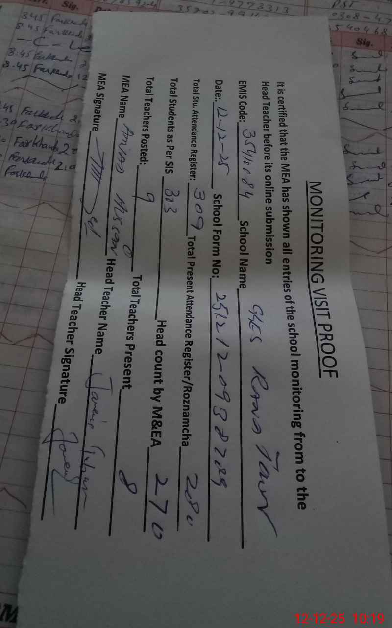 | Attendance Register | Head Teacher | MEA with School | Visit Proof |