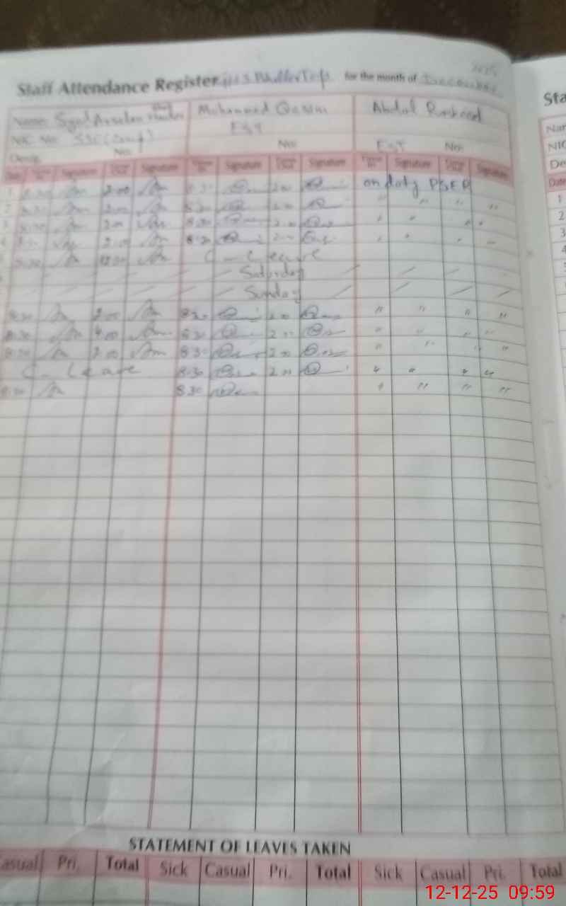| CNIC | Full Name | Designation | R/C | Absence During Last Calender Month |