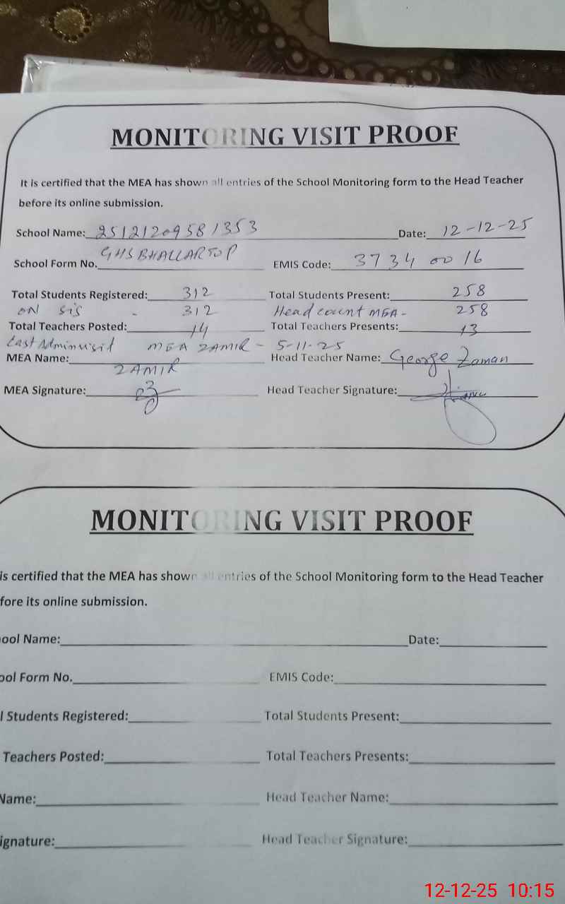 | Monitoring Date: 12-12-2025 | Start Time: 12-12-2025 09:39 AM | End Time: 12-12-2025 10:15 AM | Name of MEA: Za**** Ah**** | |