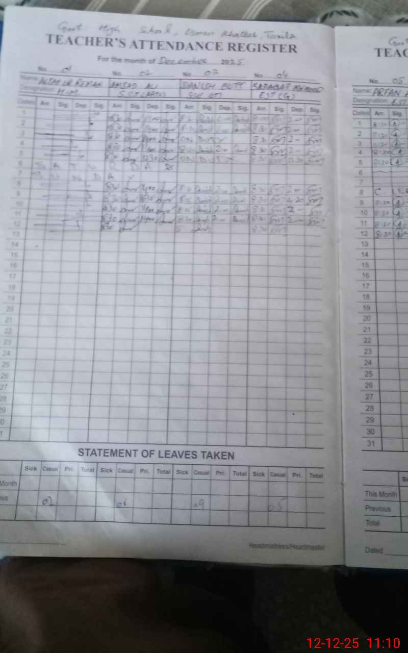 | CNIC | Full Name | Designation | R/C | Absence During Last Calender Month |