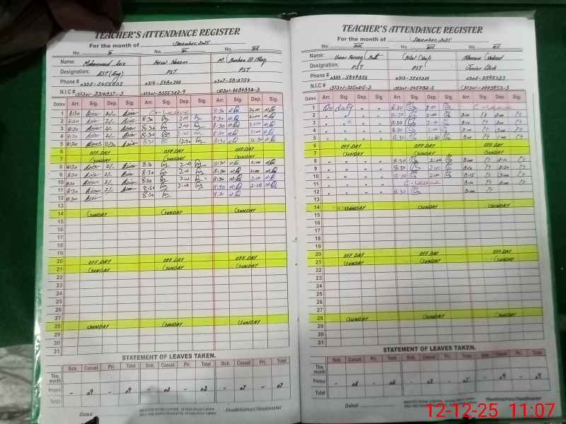| CNIC | Full Name | Designation | R/C | Absence During Last Calender Month |