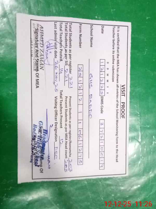 | Attendance Register | Head Teacher | MEA with School | Visit Proof |