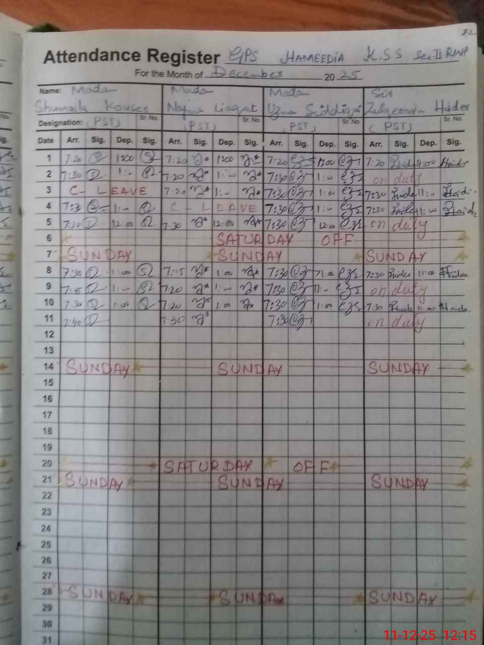 | CNIC | Full Name | Designation | R/C | Absence During Last Calender Month |